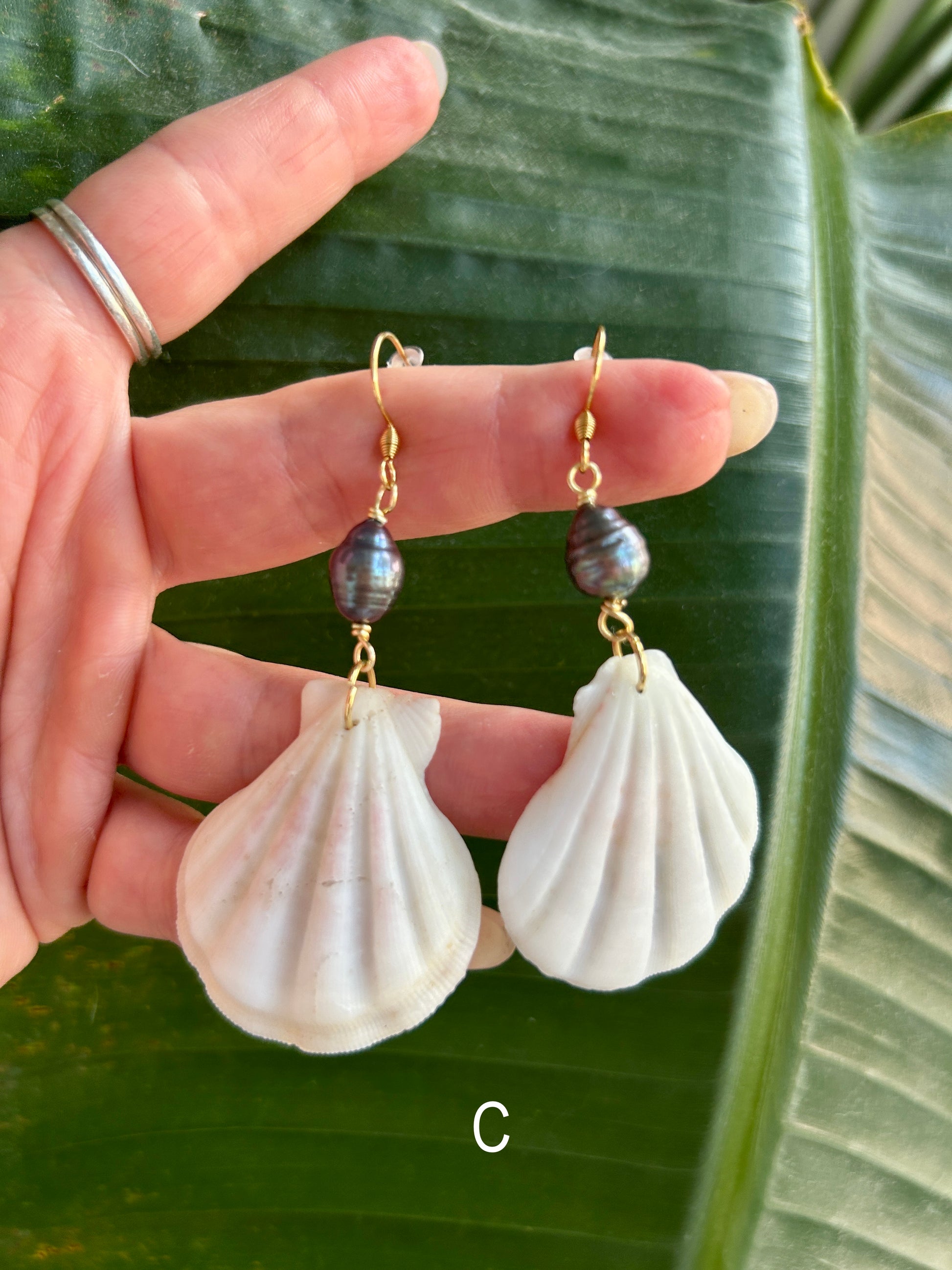 Featuring the distinctive fan-shaped shells of Nodipecten nodosus — the Lion’s Paw scallop — these earrings pair each shell with a luminous black or white keshi pearl. Known for their striking ridged shells and ability to “swim” by clapping, Lion’s Paw scallops are a vibrant example of bivalve adaptation. These earrings celebrate the elegance and engineering of the ocean, capturing both form and function in wearable art.