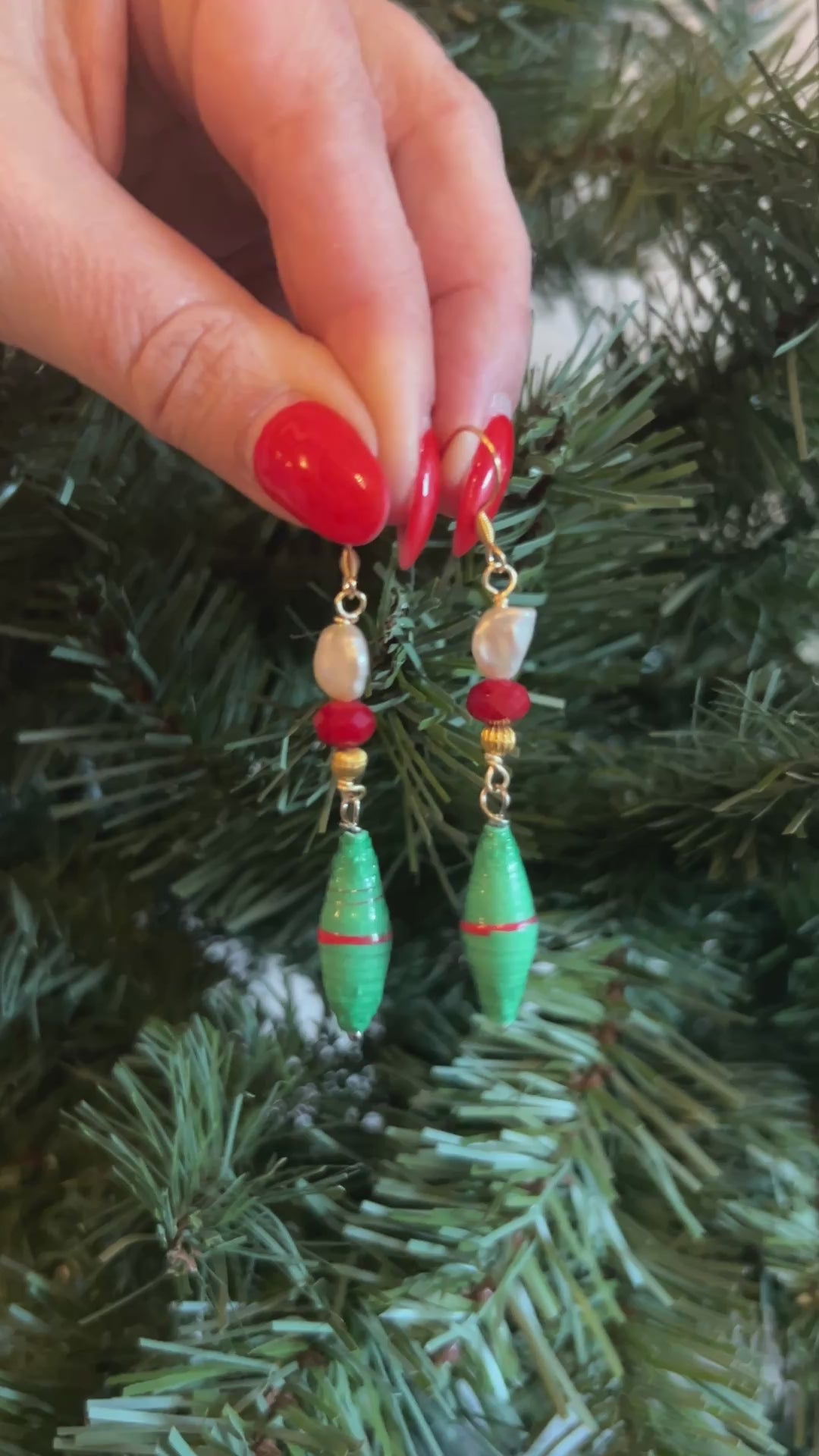 These fun, mixed-metal holiday earrings were made from a necklaced that was sourced second hand. The material is unknown, but is extremely lightweight and the beads are dressed up with a white keshi pearl.